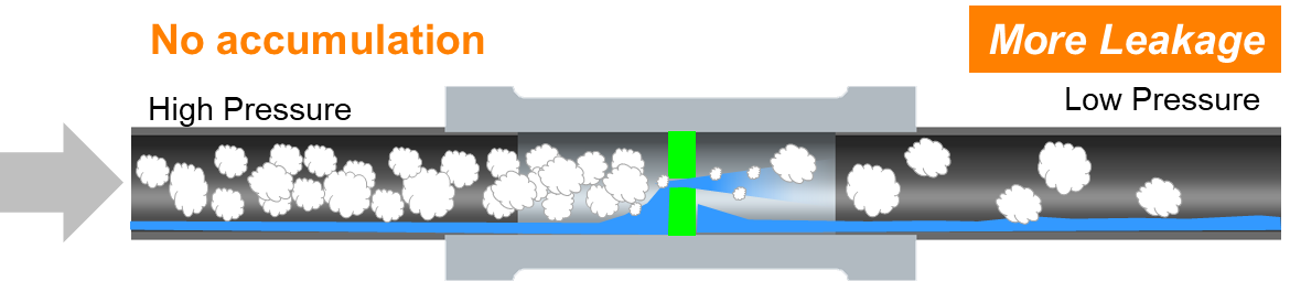 Even though a bigger nozzle with 5 times larger cross section area is employed, a significant leakage saving can be achieved as compare with Intermittent traps