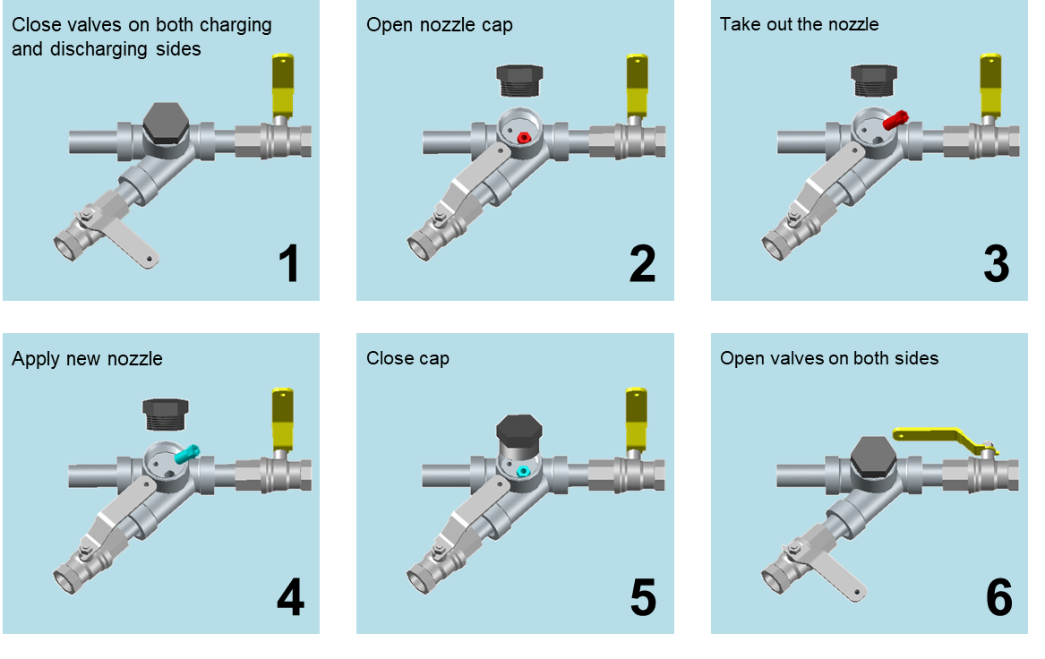 Change the nozzle just by opening nozzle cap. Quick and easy change without stopping the system