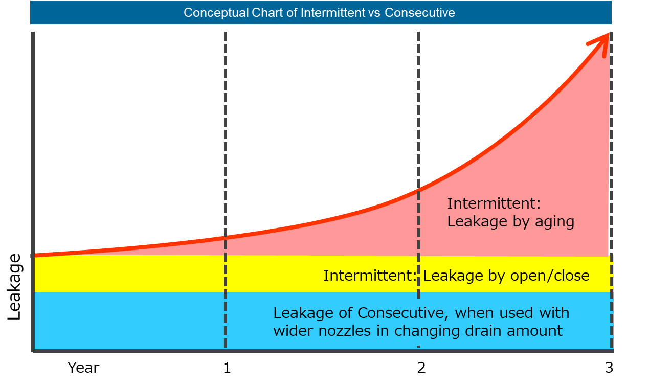 Consecutive can save leakage overtime, as compare with Intermittent Saving rates will depend on maintenance of traps and aging