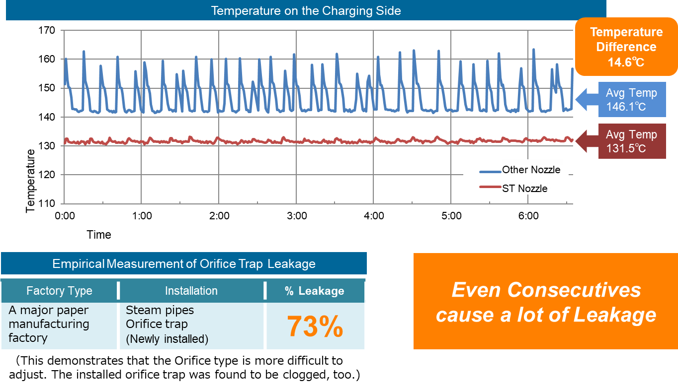 Traps with wrong diameter choice result in significant steam loss. The following chart compares our actual client case under (a) nozzle traps the client used to use and (b) ST Nozzle Type Steam Trap as appropriately Operated under the same conditions, ST Nozzle Type Steam Traps lowered both changes in temperature and the average temperature